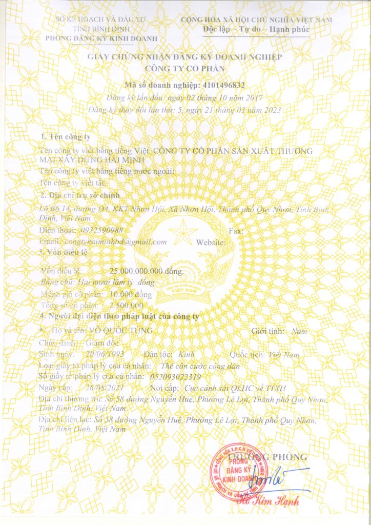 Công ty Cổ Phần Sản Xuất Thương Mại Xây Dựng Hải Minh được thành lập vào ngày 02/10/2017 với vốn điều lệ ban đầu 25 tỷ đồng, hoạt động trong các lĩnh vực chính như: sản xuất gạch xi măng cốt liệu, gạch terrazzo, ngói màu, cấu kiện bê tông, ống cống bê tông ly tâm, bê tông thương phẩm,…